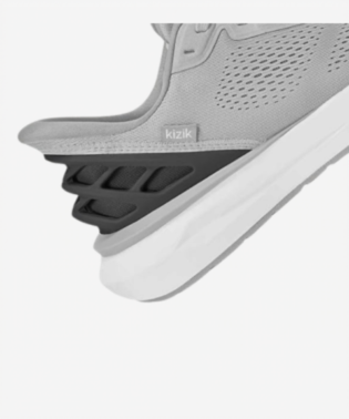 This image shows a close-up view of a modern athletic shoe, focusing on its innovative heel design. The shoe features a light grey upper with a breathable, textured fabric, while the heel area is reinforced with a distinctive black flexible support structure that appears designed for easy slip-on functionality and added stability.