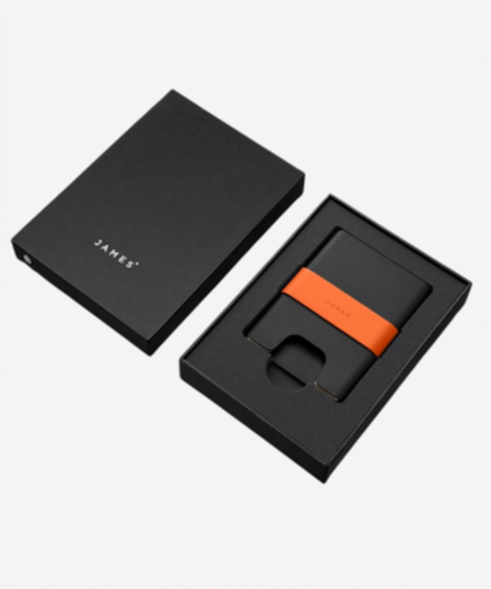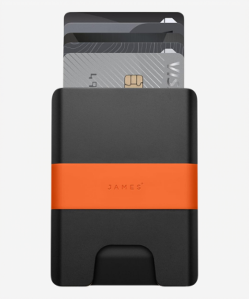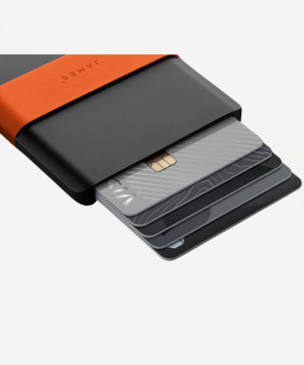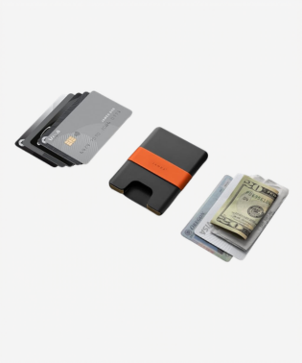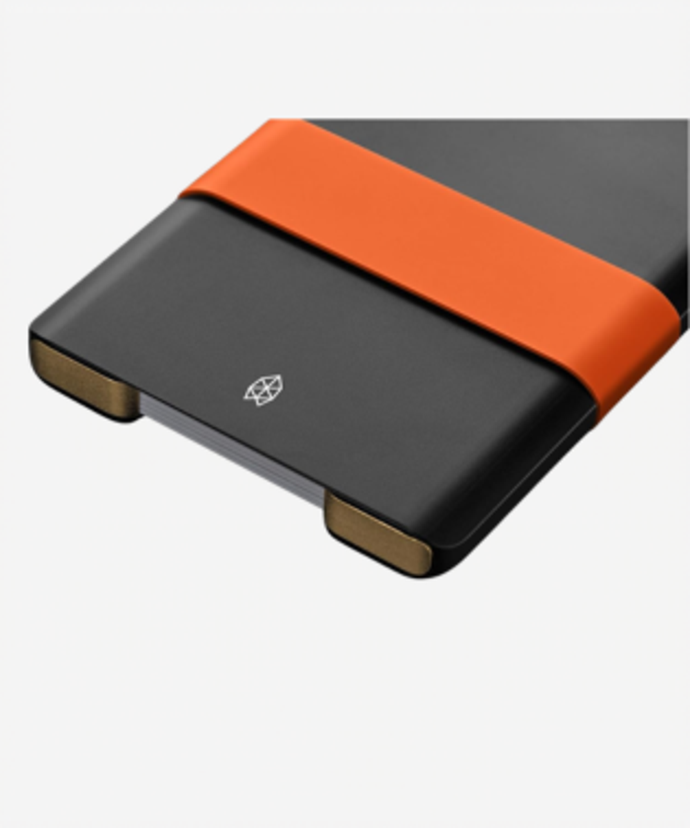 This image shows a sleek and compact minimalist wallet with a modern black finish, accented by a bold orange elastic band across the center that securely holds the contents in place. Several cards are partially visible at the top, indicating easy access and efficient storage.