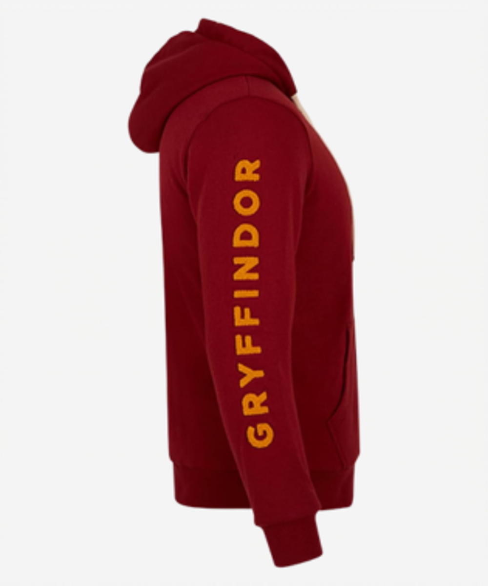 This image shows a side view of a stylish red hooded sweatshirt, highlighting its clean and modern design. The hoodie features a smooth, well-fitted silhouette with a comfortable hood resting at the back, while the sleeve is prominently printed with bold yellow “GRYFFINDOR” text, adding a distinctive and eye-catching detail.