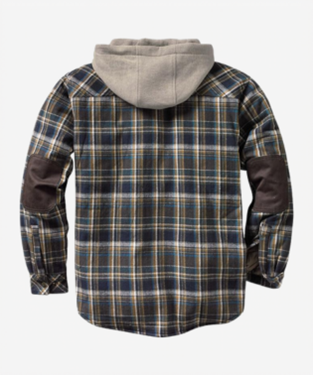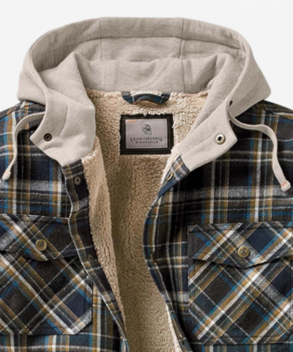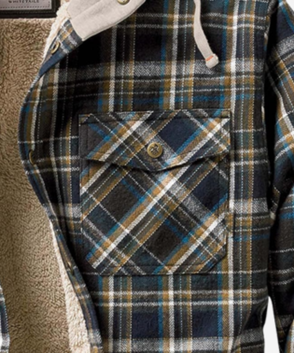 This image shows a close-up view of a stylish plaid hooded jacket, highlighting its detailed chest pocket design. The fabric features a classic check pattern in shades of blue, brown, and cream, giving it a rugged yet fashionable look. The pocket is neatly stitched with a flap and button closure, adding both functionality and visual appeal. Part of the soft inner lining is visible on the left side, suggesting warmth and comfort, while the hood’s drawstring can be seen at the top, enhancing its casual outdoor style.