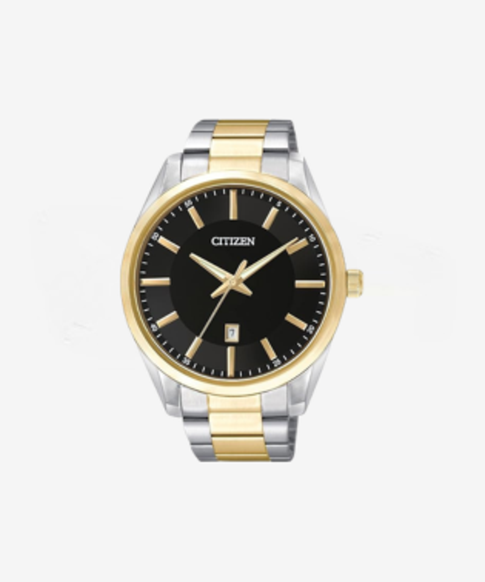 - Stainless steel and gold-tone watch featuring sleek black dial with stick markers, luminous hands, and date window at six o’clock