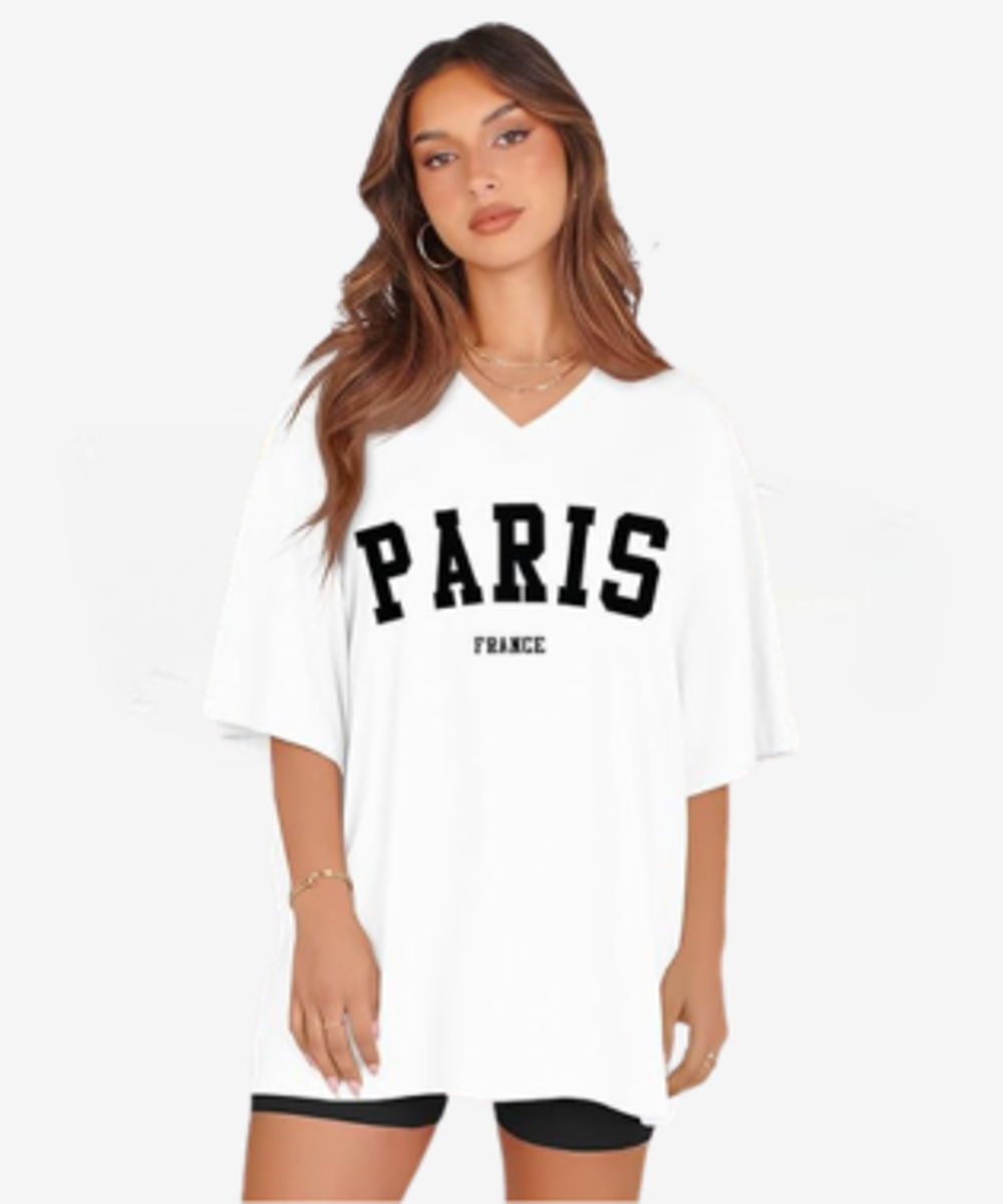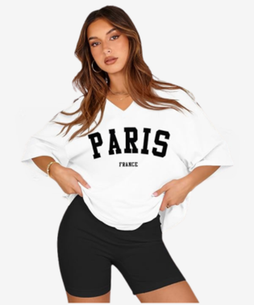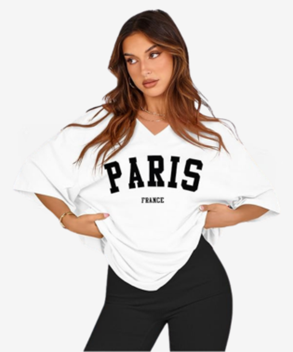 Trendy women’s white t-shirt featuring a bold “PARIS FRANCE” print for a chic, casual look.