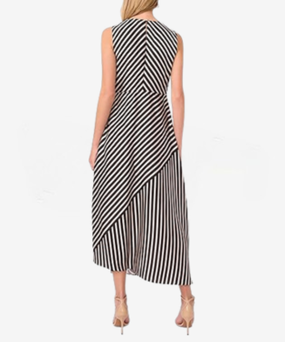 This stylish women’s sleeveless midi dress features a bold black and white striped pattern that creates a modern and eye-catching look. Designed with an asymmetric hem and a flattering flowy silhouette, it offers both comfort and elegance for everyday wear or casual outings. The lightweight fabric drapes beautifully, making it a versatile choice for warm weather while adding a chic touch to your wardrobe.